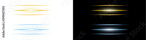 PNG image of Collection of glowing horizontal light streaks in bright golden yellow and electric blue hues on transparent background