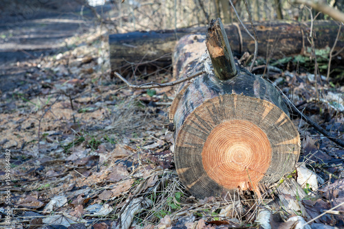 Pień po ściętym drzewie leżący przy leśnej drodze