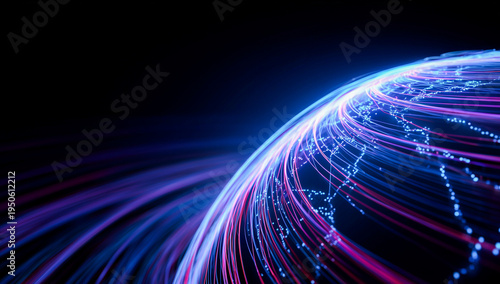 Glowing blue and purple digital earth globe with networking light trails and data lines representing global telecommunications