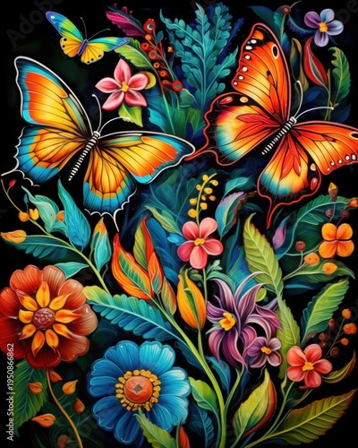 Artystyczna ilustracja przedstawiająca kolorowe motyle latające wśród egzotycznych kwiatów i liści na eleganckim czarnym tle.