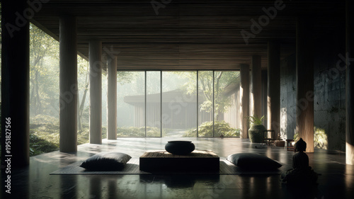 Zen Buddhism, meditation, inner peace, Chinese Japanese Asian tradition. Therapy stress release treatment, health lifestyle. A serene, tranquil room with a Buddha statue situated in the middle of it.
