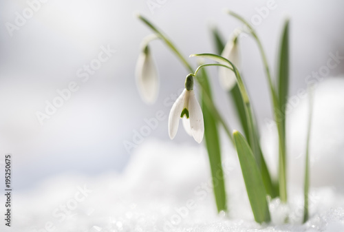 Snowdrops (Galanthus nivalis) grow out of the snow, the first flowers when spring is coming, macro shot with copy space in the snowy background