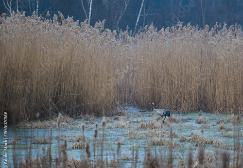 Żuraw brodzący w stojącej turkusowej wodzie pośród wysokich żółtych wodnych trzcin