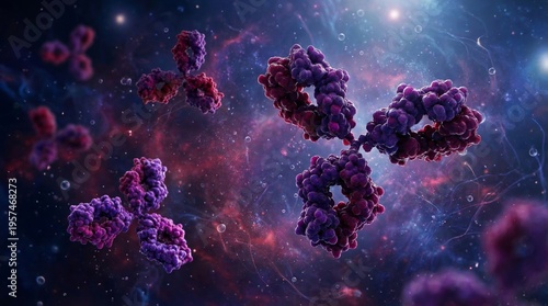 Microscopic render of magenta immunoglobulin antibodies defending against viral pathogens in plasma