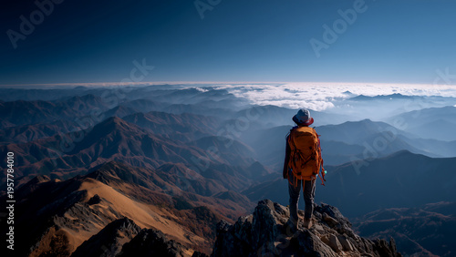 壮大な雲海と山々を眺める山頂のハイカーと絶景