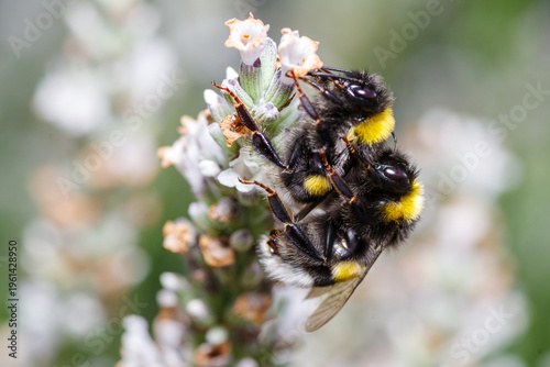 Puszysty trzmiel na białym kwiatku lawendy. Makrofotografia przyrody, owad zapylający w akcji. Naturalne światło i miękkie tło bokeh. Symbol ekologii i ochrony środowiska oraz bioróżnorodności.