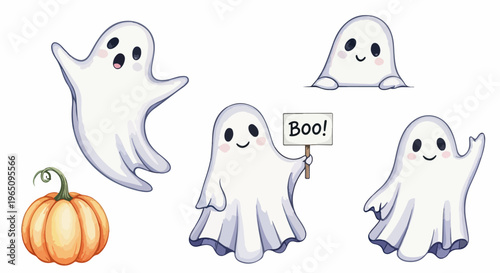Zestaw uroczych rysunkowych duchów w różnych pozach z pomarańczową dynią na białym tle, idealny element dekoracyjny na Halloween i jesienne projekty.