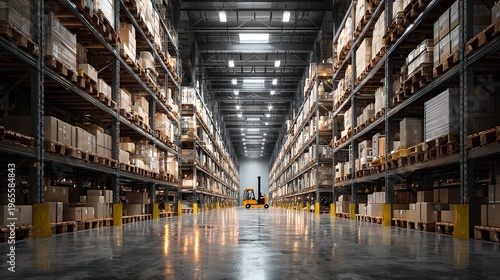 広大な物流倉庫の内部とフォークリフト、高い棚に積み上げられた在庫品 - サプライチェーン、ロジスティクス、在庫管理、配送センターのイメージに
