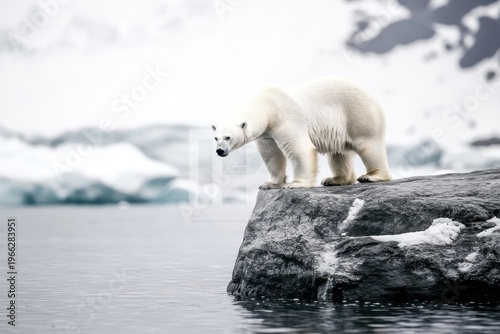 Samotny niedźwiedź polarny stoi na skalistej krawędzi nad zimną wodą Arktyki.