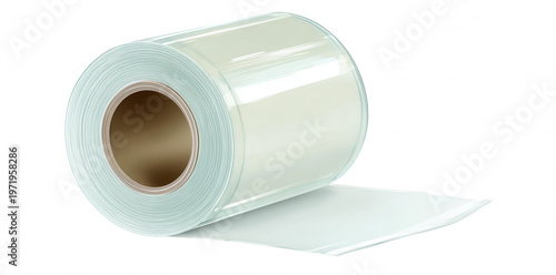 Duża rolka przezroczystej folii stretch do pakowania, zabezpieczania towarów lub zastosowań przemysłowych, izolowana na białym tle.