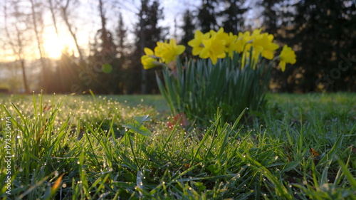 Kępa żonkili w trawie z kroplami rosy w porannym świetle słońca