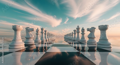 Dramatic Chessboard Path with White Chess Pieces in Sunset Light
