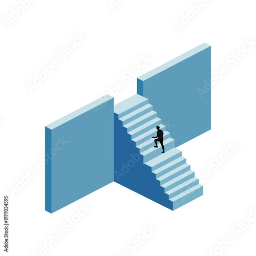 Businessman Climbing Stairs Between Walls Breaking Through Barrier Concept of Career Growth Success and Overcoming Obstacles Isometric Vector Illustration