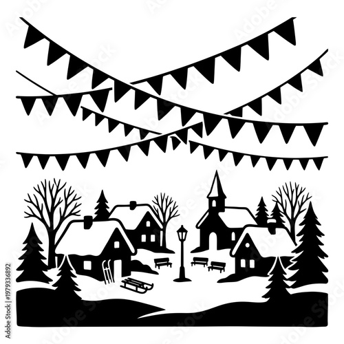Riverside path lined with festival bunting silhouette