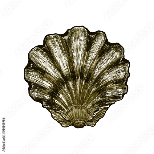 Hand Drawn Scallop Seashell Vintage Engraving Marine Line Art. Vintage scallop seashell engraving illustration with detailed linework marine shell isolated on background nautical ocean nature design