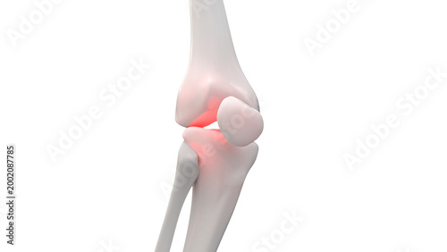 High-quality 3D anatomical render of a human knee joint featuring femur. The image shows a red glowing area representing inflammation, arthritis, or injury, isolated on a transparency BG.