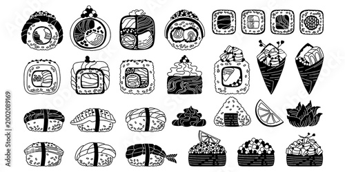 Sushi Icon Set Roll Nigiri Sashimi Chopstick Japanese Food Flat Isolated Transparent Background Vector Illustration