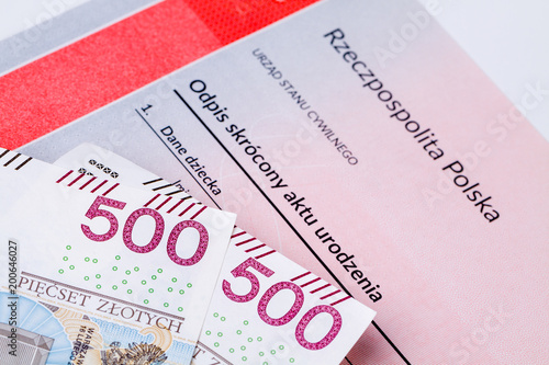 Five hundred polish zloty on birth certificate, concept of polish social program named 500 plus.