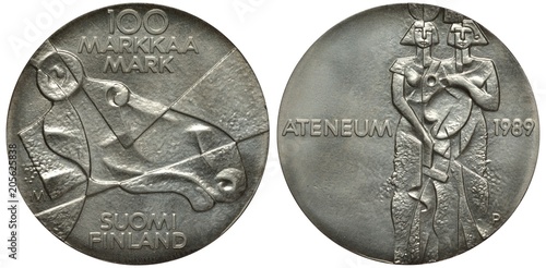 Finland Finnish coin one hundred mark 1990, Ateneum Central Museum of Arts, moose head, stylized female figures, silver,