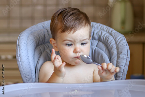Cute little baby boy looking at spoon in his hand with funny bewildered face expression thinking what to do with it