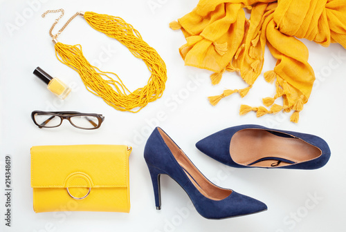Bright yellow accessories and blue shoes for girls and women. Urban fashion, beauty blog concept