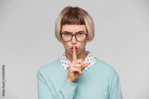 Closeup of serious strict young woman wears blue sweatshirt and spectacles looks displeased and shows silence gesture isolated over white background