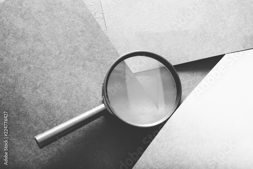 magnifier on grey layered paper background. searching seeking looking recruiting and headhunting concept.