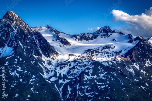 ośnieżone szczyty Alp austriackich, częściowo oświetlone
