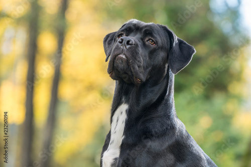 Portrait of a Cane Corso dog breed on a nature background. Dog playing on the grass with colored leaves in autumn. Italian mastiff puppy.