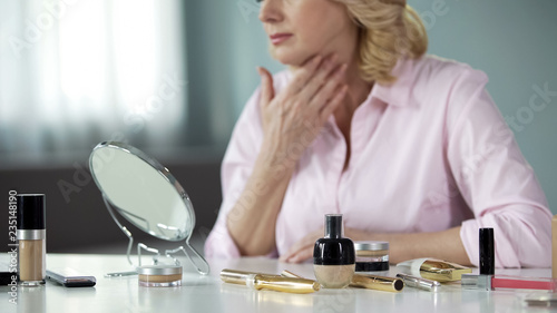 Woman carefully examining her aging and sagging skin pondering about lifting