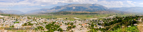 A panoramic view over town Gjirokaster and river Lumi Drino (Albania) from the Ali Pasha's fortress