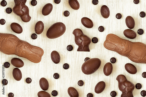 Easter background with chocolate candies in the shape of rabbit, chicken, eggs and sweets. Chocolate easter eggs. Flat lay. View from above