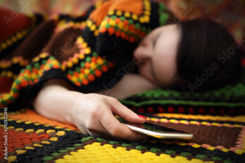 Uzależnienie od telefonu. Kobieta śpi trzymając telefon w dłoni.