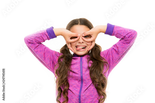 Cheerful grimace. Girl holding fingers like glasses mask superhero or owl. Play game with mask superhero. Child cheerful mood grimace with mask. Pretend be fantastic hero. Kid hide face finger mask