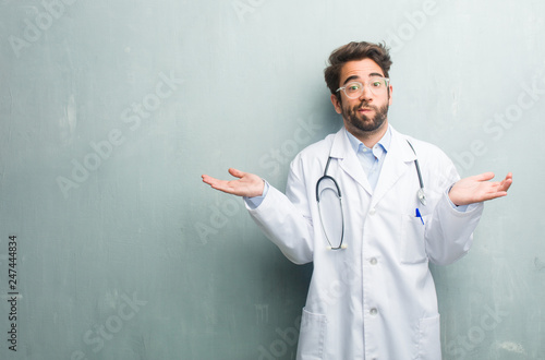 Young friendly doctor man against a grunge wall with a copy space doubting and shrugging shoulders, concept of indecision and insecurity, uncertain about something
