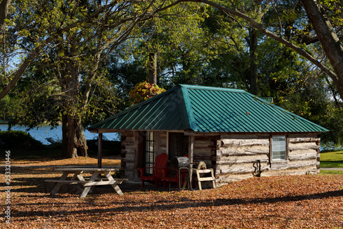 Rustic log cabin in the Fall on Lake on the Mountain Provincial Park with sinkhole lake Prince Edward County Ontario Canada