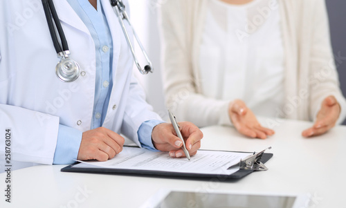 Unknown woman doctor and female patient discussing something while standing near reception desk in emergency hospital. Physician at work in clinic. Medicine and health care concept