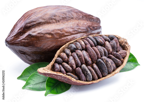 Cocoa pods and cocoa beans -chocolate basis isolated on a white background.