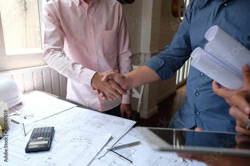 engineer handshaking. architect shaking hands for building construction project. teamwork cooperation concept