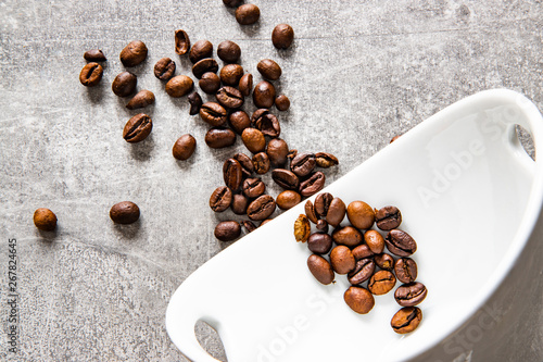 Ziarenka kawy na betonowym tle wraz z białą miską