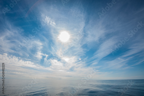 Noon sun shining through cirrus clouds over the open calm ocean.