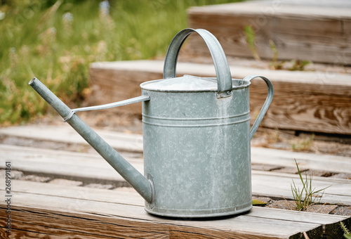 Old metal watering can standing on the wooden stairs of a terrace in the garden with grass and plants in the background