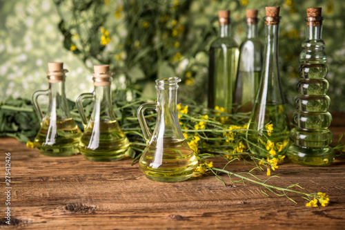 Rapeseed flowers and rapeseed oil in a bottle on the table