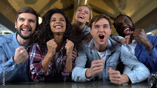 Positive young people rooting for team goal, watching match together, audience