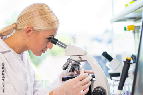 Medical doctor working in research lab. Science assistant making experiments. Laboratory tools: microscope, test tubes, equipment. Chemistry, medicine, biochemistry and healthcare.