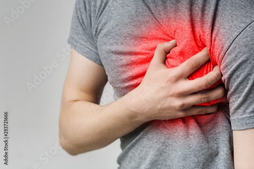 Caucasian man having heart ache, holding hand on chest