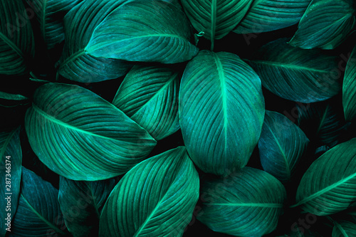 leaves of Spathiphyllum cannifolium, abstract green texture, nature background, tropical leaf