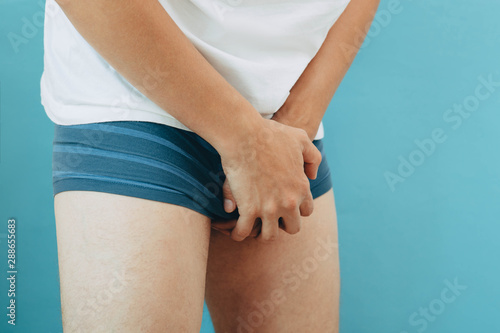 man wearing underpants holding genitals. urological diseases, pain during urination