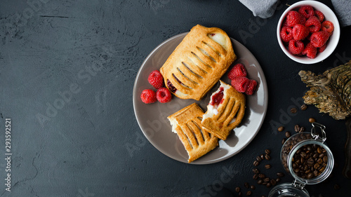 Ciastko francuskie z malinami i kremem. Widok z góry, ciemne tło, miejsce na tekst.