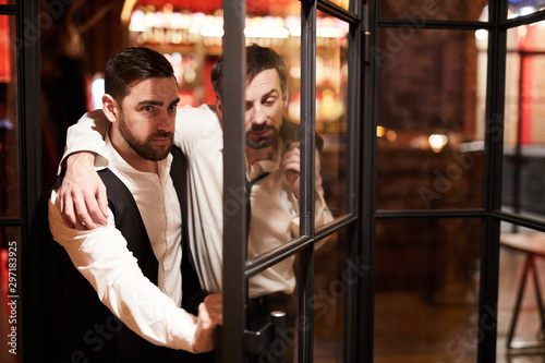 Portrait of bearded man carrying drunk businessman through door while leaving bar late night after work, copy space